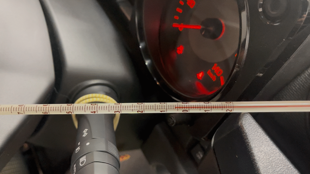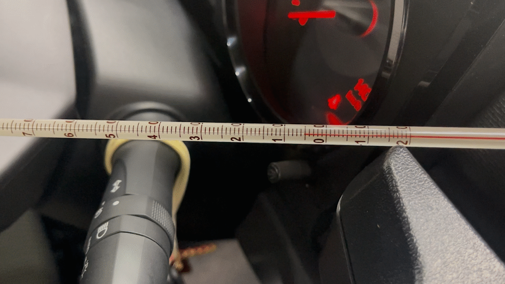パワーエアコンを補充する前に、吹き出し口からの冷風の温度を測っておきます。新車から大体9ヶ月たった車両ですが6°Cでした。まだ新しいってこともあり、MAXだと寒いくらいに冷えます。