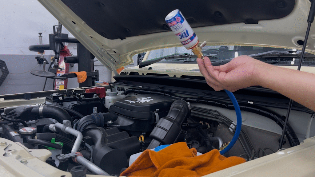 エアコン配管の低圧側に補充用のホースを繋ぎます。繋いだらホースについているパージバルブを押して、ホース内の空気を抜きます。空気が抜けたら缶をよく振ってからホースに繋げます。