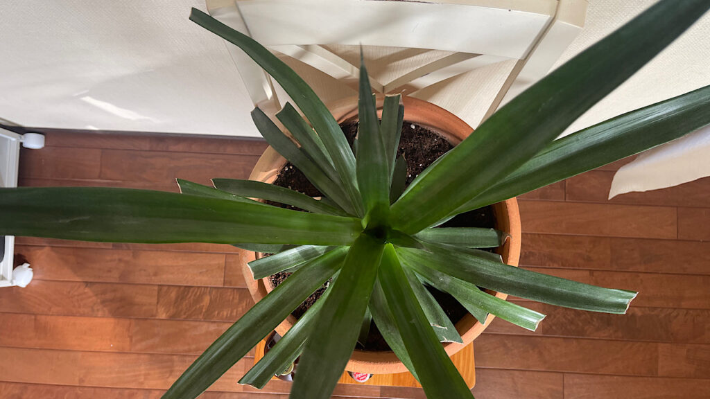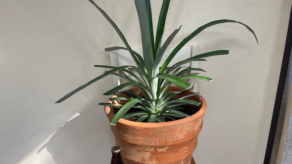 2024年7月1にパイナップルのヘタから育てること1年1ヶ月。最近は、かなり大きくなってきました。縦にも横にも。根っこも安定して張ってくれたみたいで何よりです。