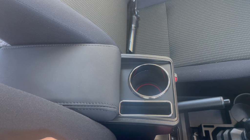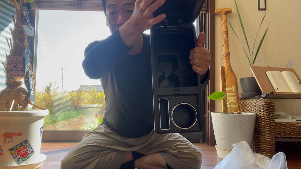 アームレスト下部の凸部を車両側の純正ドリンクホルダーにカポッとはめ込むだけ。