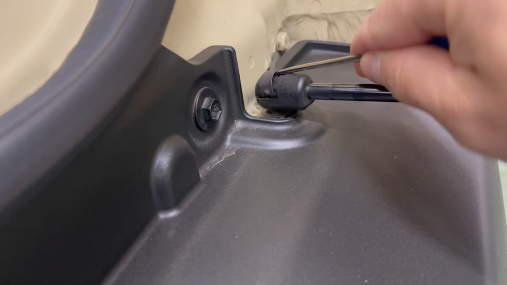 交換は、ものすごく簡単です。純正のバックドアダンパーの先端についている鉄のクリップを、付属しているマイナスドライバーを使って浮かせます。