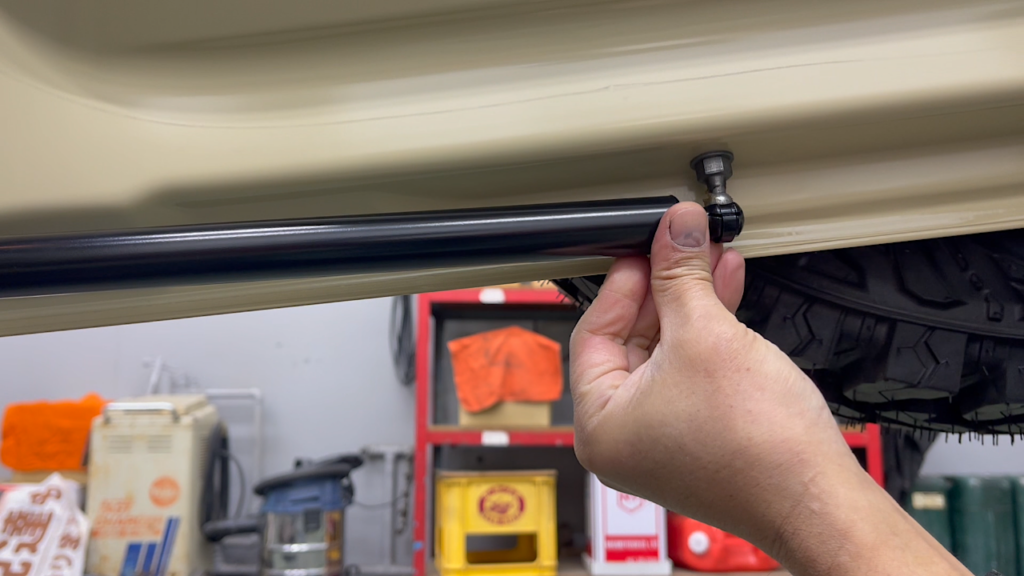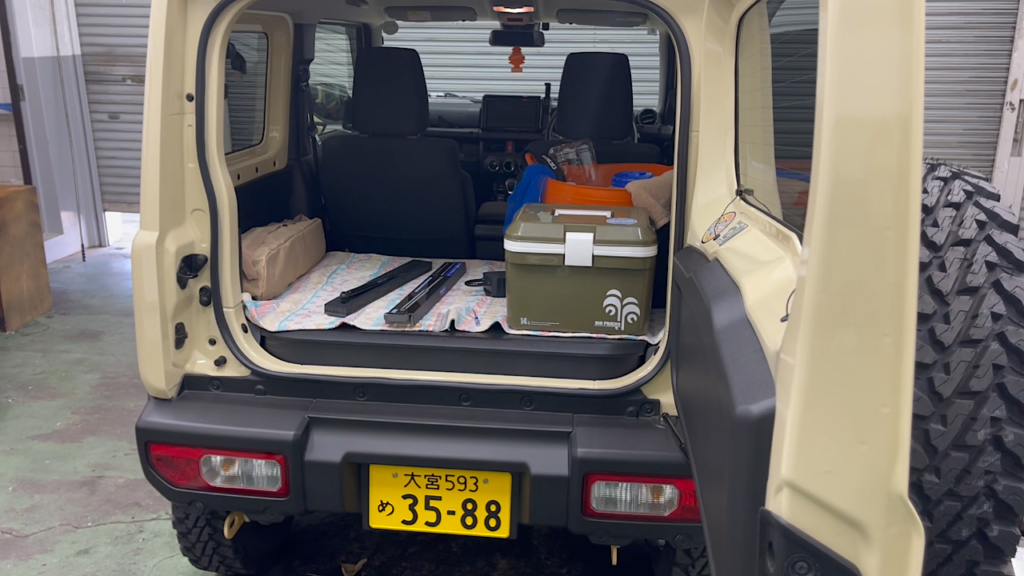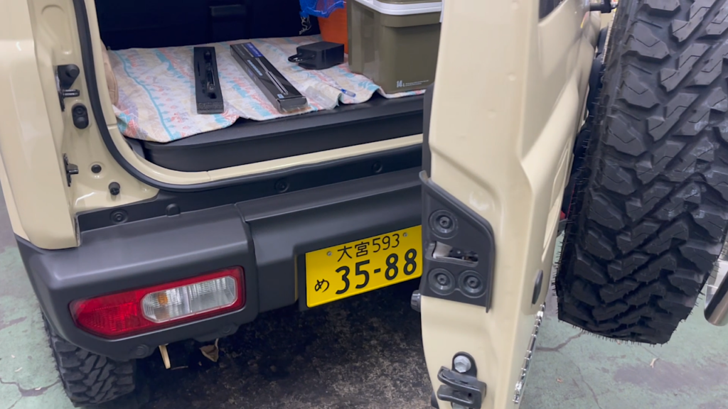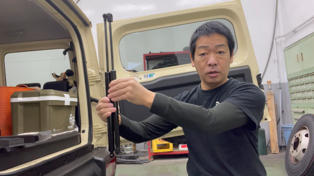 作業は、平坦な場所で行ってください。ダンパーを外すとバックドアがフリーになりますので、どこまでも開いてしまうし、少しの角度でドアが動きますので気をつけて作業を行ってください。